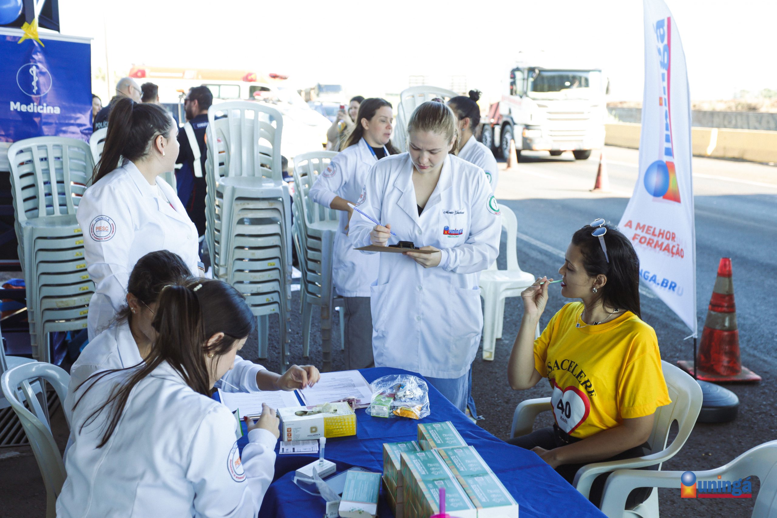Na manhã desta quinta-feira (8) os cursos de Enfermagem, Farmácia, Medicina e Nutrição da UNINGÁ marcaram presença em uma importante ação educativa realizada na Unidade Operacional da Polícia Rodoviária Federal (PRF) de Mandaguari. Promovida pela Corporação em parceria com o Núcleo da Infância e Juventude, e Polícia Civil; a atividade fez parte da Campanha Maio Amarelo 2025 e esteve integrada ao Maio Laranja.