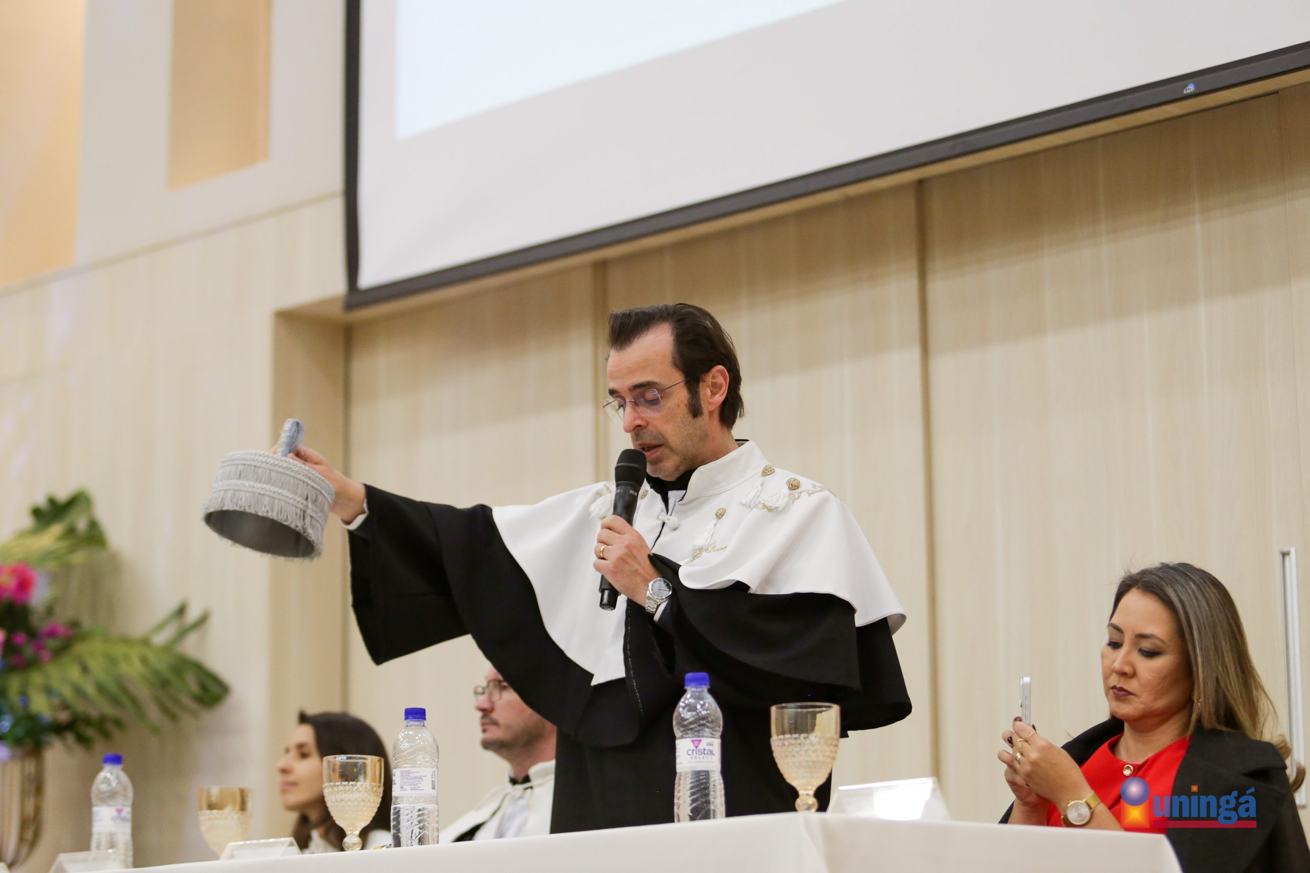 O rito de Outorga de Grau foi realizado em dois momentos distintos. A primeira cerimônia homenageou os concluintes dos cursos de Administração, Agronomia, Arquitetura e Urbanismo, Ciências Contábeis, Design Gráfico, Engenharia de Produção, Engenharia Mecânica, Gestão de Recursos Humanos, Gestão Financeira, Jornalismo, Letras Licenciatura, Marketing, Pedagogia, Processos Gerenciais e Serviço Social. A mesa de honra foi composta pela pró-reitora Gisele Colombari, o diretor de Gestão em EAD, Ricardo Dantas Lopes, o diretor de Assuntos Acadêmicos Rogério Tiyo e a diretora de Ensino e Supervisão Pedagógica Silvia Christiane Goya.