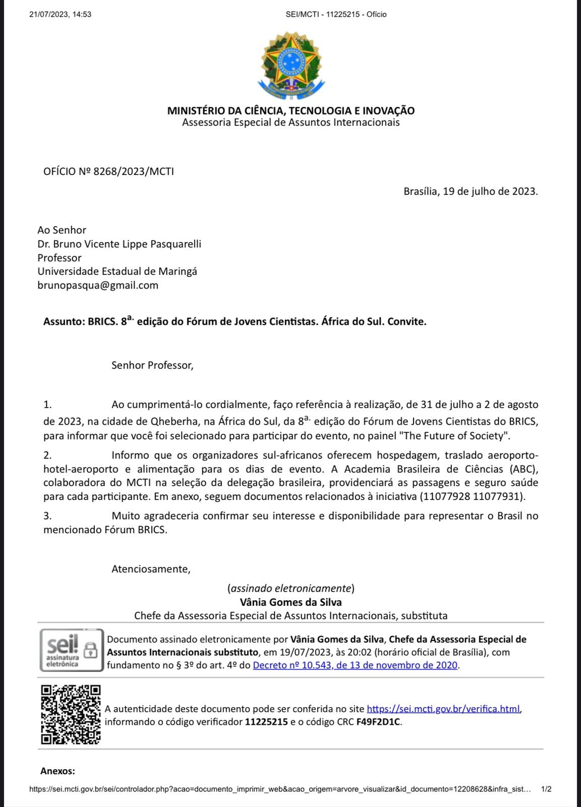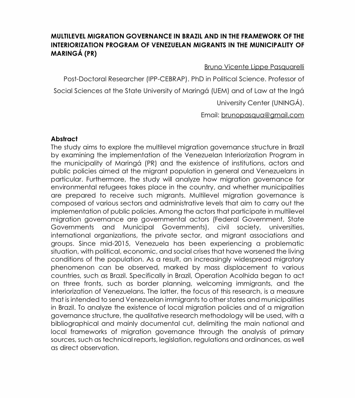 Com a sua pesquisa selecionada pelo Ministério da Ciência e Tecnologia do Brasil, Bruno irá apresentar seu trabalho com o tema sobre a imigração dos venezuelanos em Maringá. O professor ressalta: “Esse trabalho é a minha pesquisa de pós-doutorado que venho desenvolvendo no Centro Brasileiro de Análise e Planejamento em São Paulo e também faz parte do meu projeto de pesquisa que está na UNINGÁ.”.
