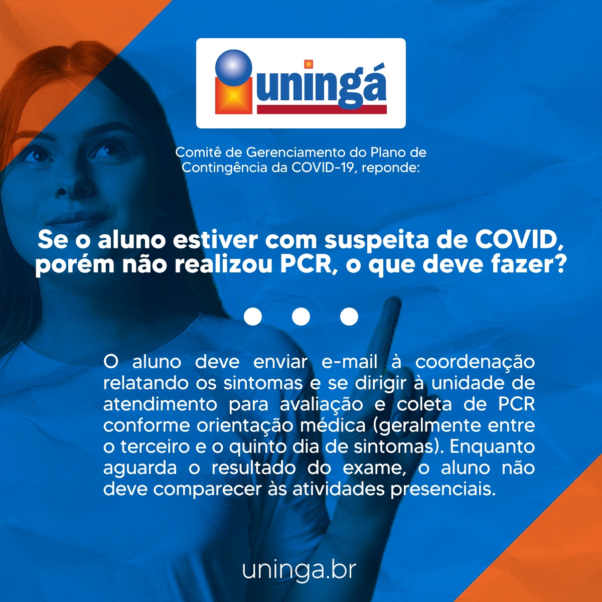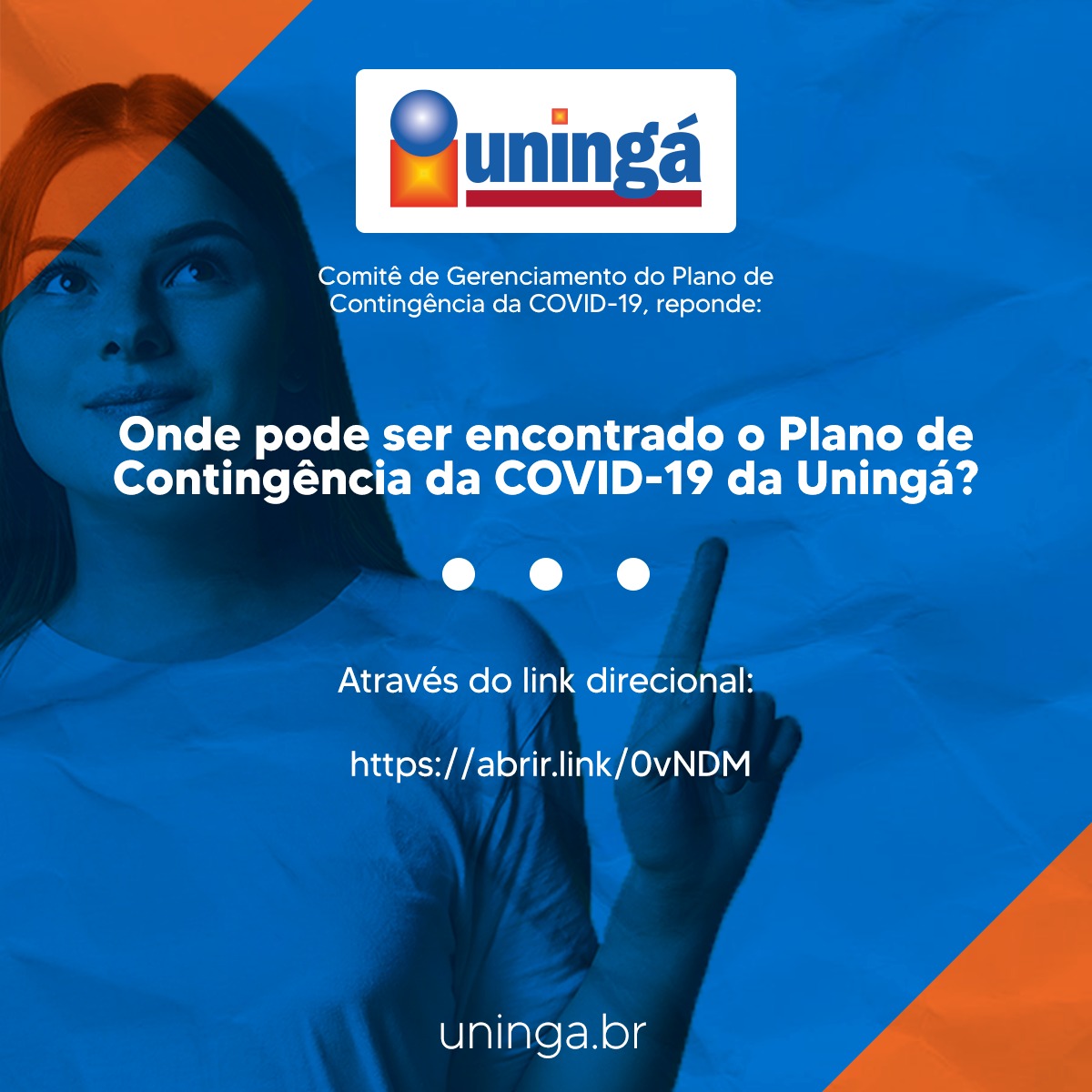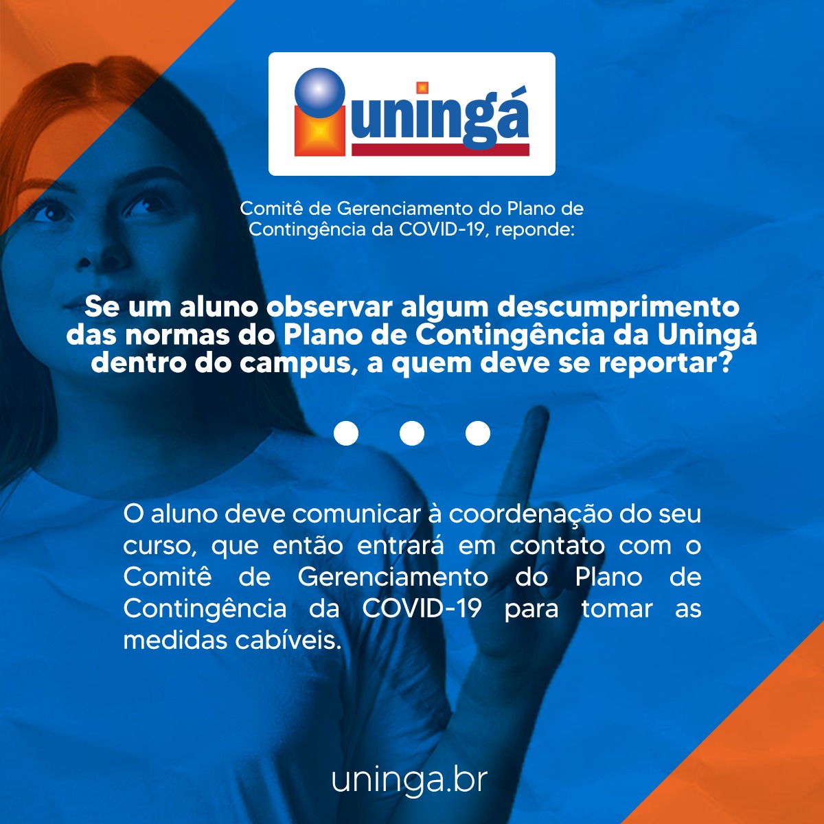 A Uningá trabalha para assegurar a segurança de seus acadêmicos e colaboradores a todo momento, por isso, foi elaborado com um corpo de especialistas o Plano de Contingência a Covid-19, a fim de evitar qualquer disseminação do vírus no campus.