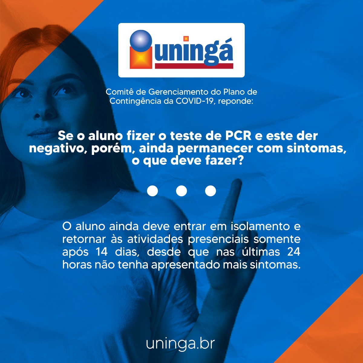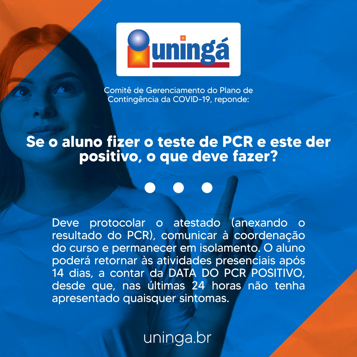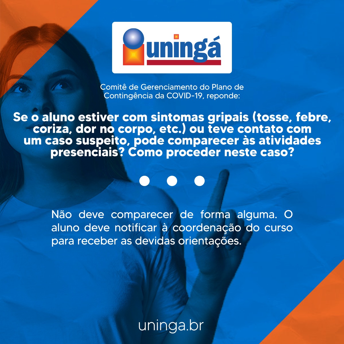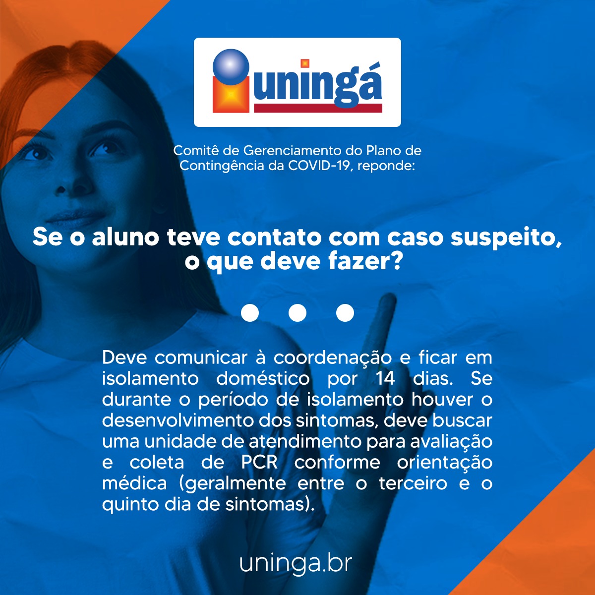 A Uningá trabalha para assegurar a segurança de seus acadêmicos e colaboradores a todo momento, por isso, foi elaborado com um corpo de especialistas o Plano de Contingência a Covid-19, a fim de evitar qualquer disseminação do vírus no campus.