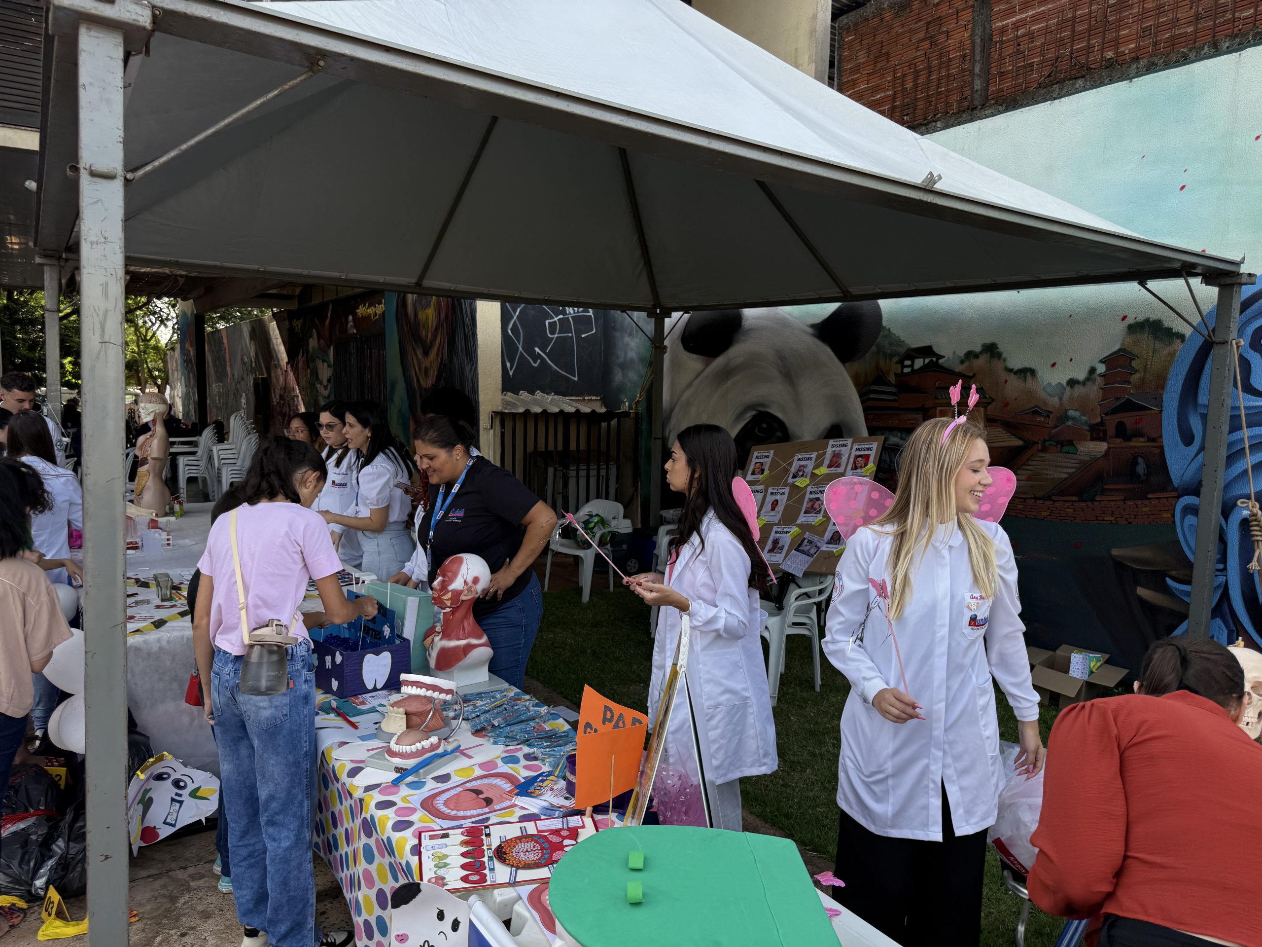 Acadêmicos dos cursos de Odontologia, Biomedicina, Medicina, Enfermagem e Terapia Ocupacional conduziram dinâmicas lúdicas e informativas, proporcionando momentos de aprendizado, cuidado e diversão para o público infantil. As ações tiveram como foco despertar hábitos saudáveis desde a infância e aproximar os participantes do universo da saúde de forma leve e educativa.